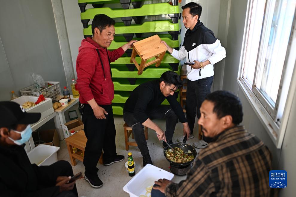 在青海省玉樹藏族自治州曲麻萊縣秋智鄉(xiāng)布甫村陽光幼兒園,秋智鄉(xiāng)幼兒園副園長才仁戰(zhàn)斗(左三)在板房內為孩子們準備午餐(9月14日攝)。新華社記者 張宏祥 攝