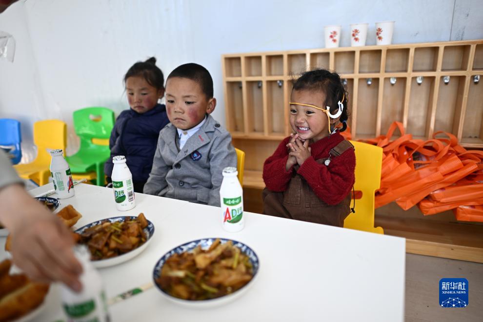 在青海省玉樹藏族自治州曲麻萊縣秋智鄉(xiāng)布甫村陽光幼兒園,丁增巴桑(右一)和伙伴們準備吃午餐(9月14日攝)。新華社記者 張宏祥 攝