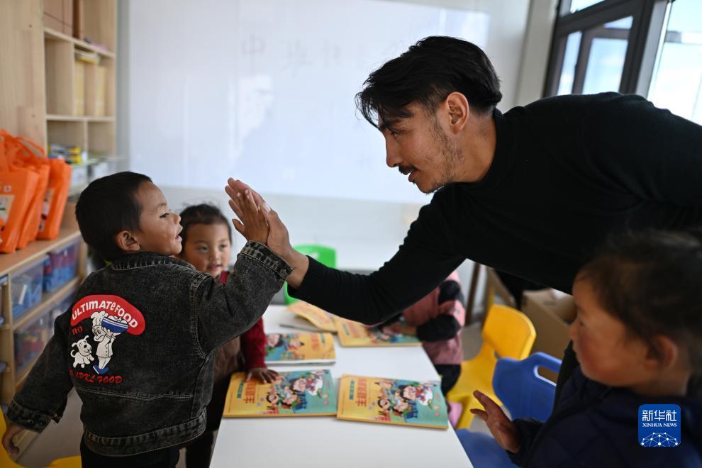 在青海省玉樹藏族自治州曲麻萊縣秋智鄉(xiāng)布甫村陽光幼兒園,秋智鄉(xiāng)幼兒園副園長才仁戰(zhàn)斗(右二)在課堂上和小朋友互動(9月14日攝)。新華社記者 張宏祥 攝