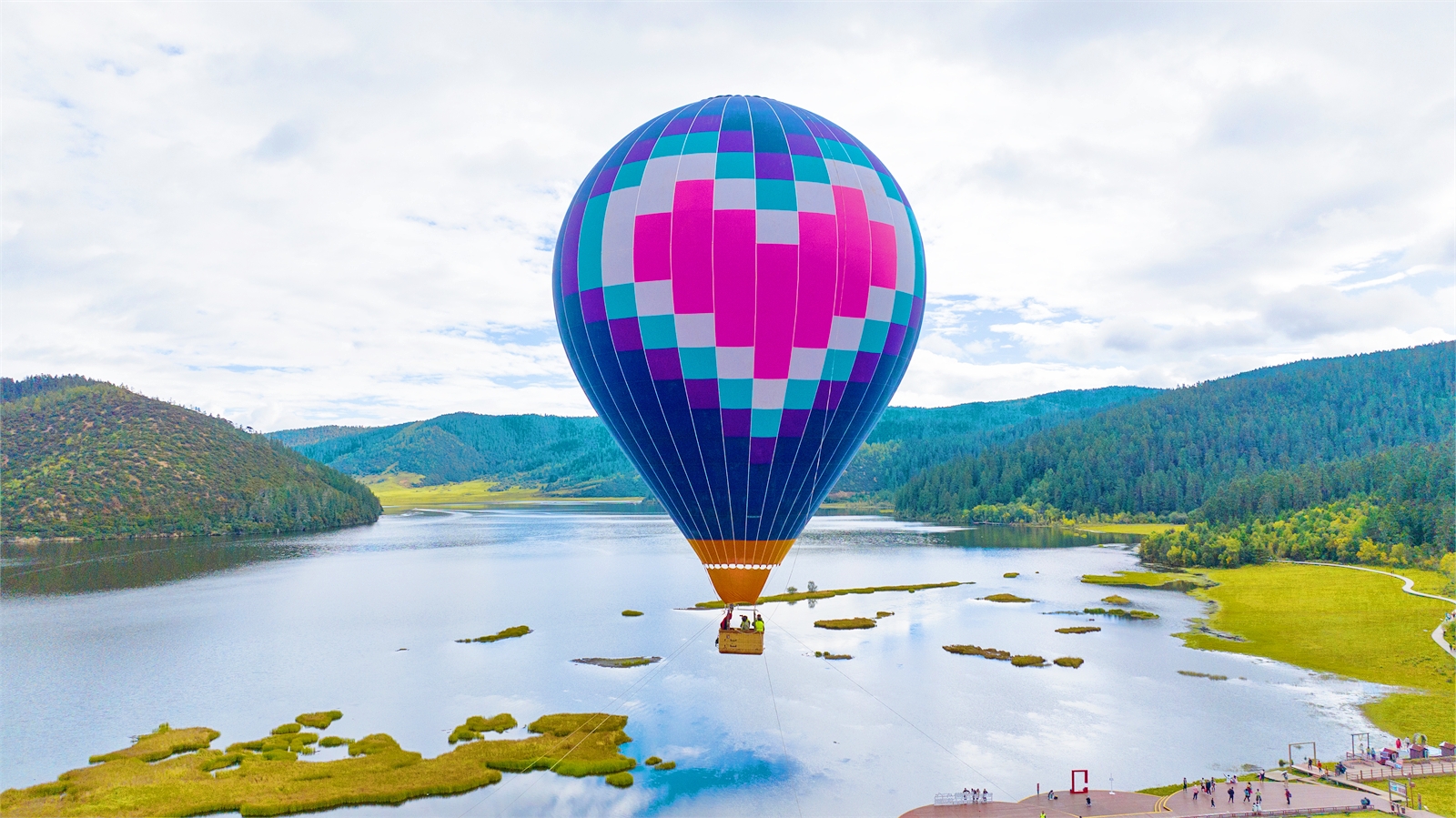 國慶假期期間,香格里拉普達措國家公園新增直升機和熱氣球低空觀光體驗項目,讓游客從高空俯瞰神秘而壯麗的普達措公園美景。
