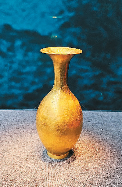 日前開(kāi)展的“青海都蘭熱水墓群精品文物展”展出的的金胡瓶。 趙曉霞 攝