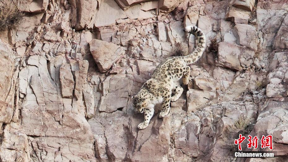 圖為雪豹在懸崖峭壁間游走。李明 攝