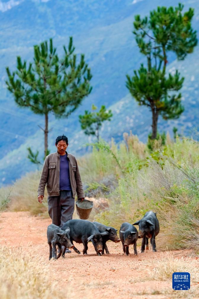10月13日,在鄉(xiāng)城縣“蘋果+藏豬”種養(yǎng)循環(huán)現(xiàn)代農(nóng)業(yè)園區(qū)內(nèi),當(dāng)?shù)夭刈迦罕姼窠q翁斗為青德鎮(zhèn)仲德村藏豬養(yǎng)殖專業(yè)合作社放養(yǎng)藏豬。新華社記者 沈伯韓 攝