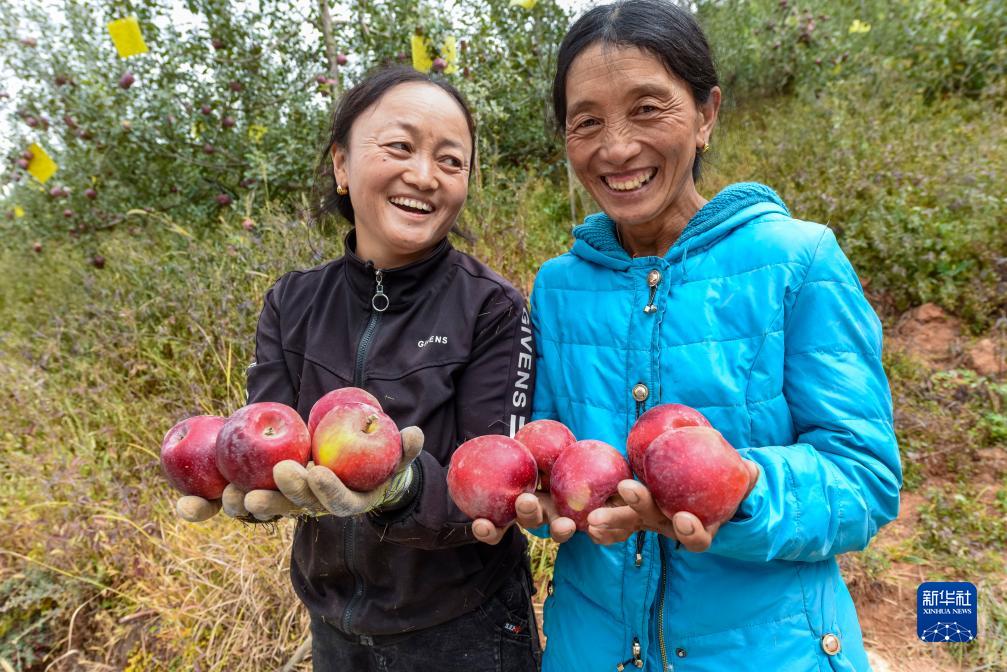10月13日,在鄉(xiāng)城縣“蘋果+藏豬”種養(yǎng)循環(huán)現(xiàn)代農(nóng)業(yè)園區(qū)內(nèi)的有機(jī)蘋果種植示范基地,當(dāng)?shù)夭刈迦罕娞ㄗ螅┖筒馗裾故静烧奶O果。新華社記者 黃曉勇 攝