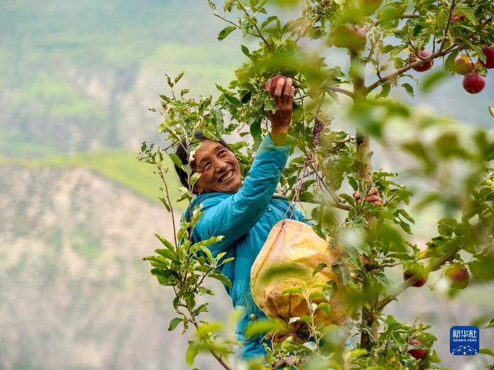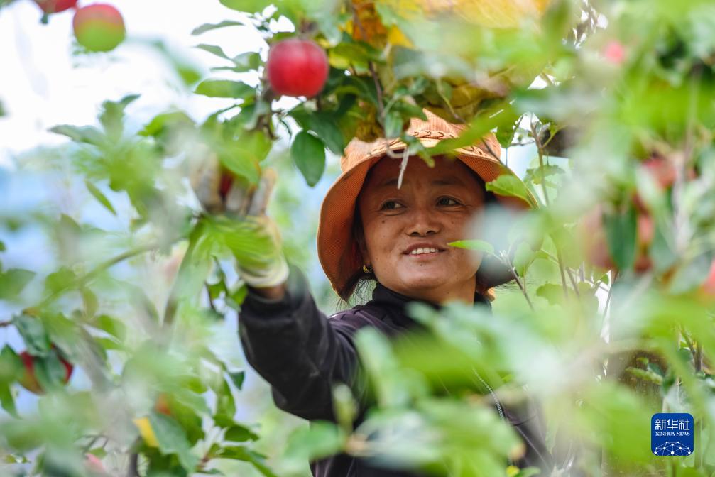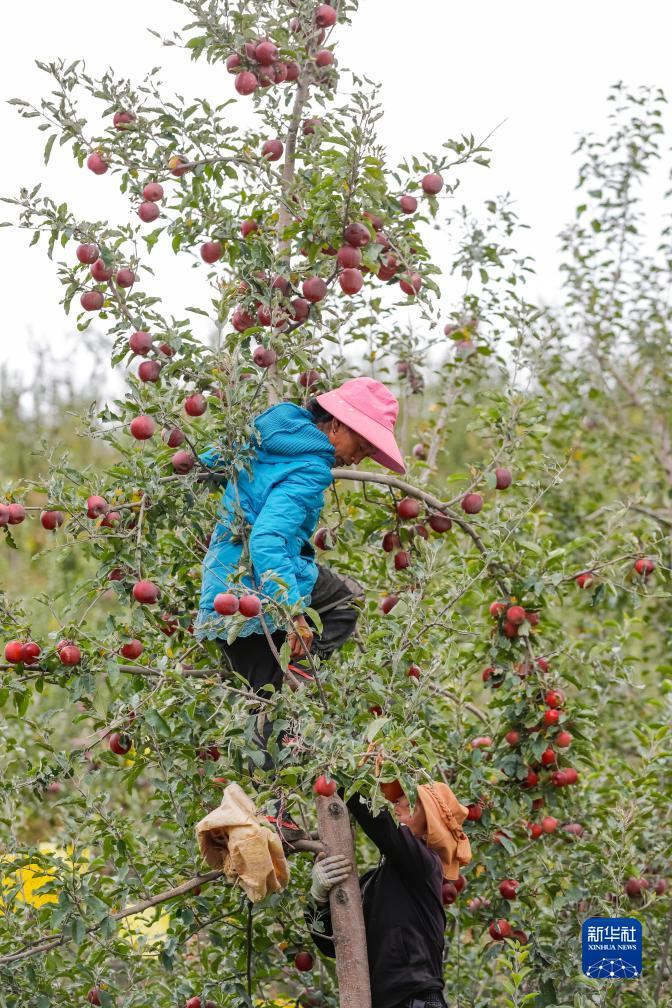 10月13日,在鄉(xiāng)城縣“蘋果+藏豬”種養(yǎng)循環(huán)現(xiàn)代農(nóng)業(yè)園區(qū)內(nèi)的有機(jī)蘋果種植示范基地,當(dāng)?shù)夭刈迦罕姴烧O果。新華社記者 沈伯韓 攝