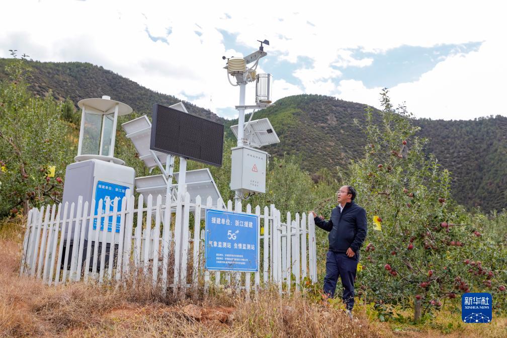 10月13日,在鄉(xiāng)城縣“蘋果+藏豬”種養(yǎng)循環(huán)現(xiàn)代農(nóng)業(yè)園區(qū)內(nèi)的有機(jī)蘋果種植示范基地,當(dāng)?shù)剞r(nóng)牧農(nóng)村和科技局的工作人員檢查氣象監(jiān)測站和蟲情監(jiān)測站的運行情況。新華社記者 沈伯韓 攝