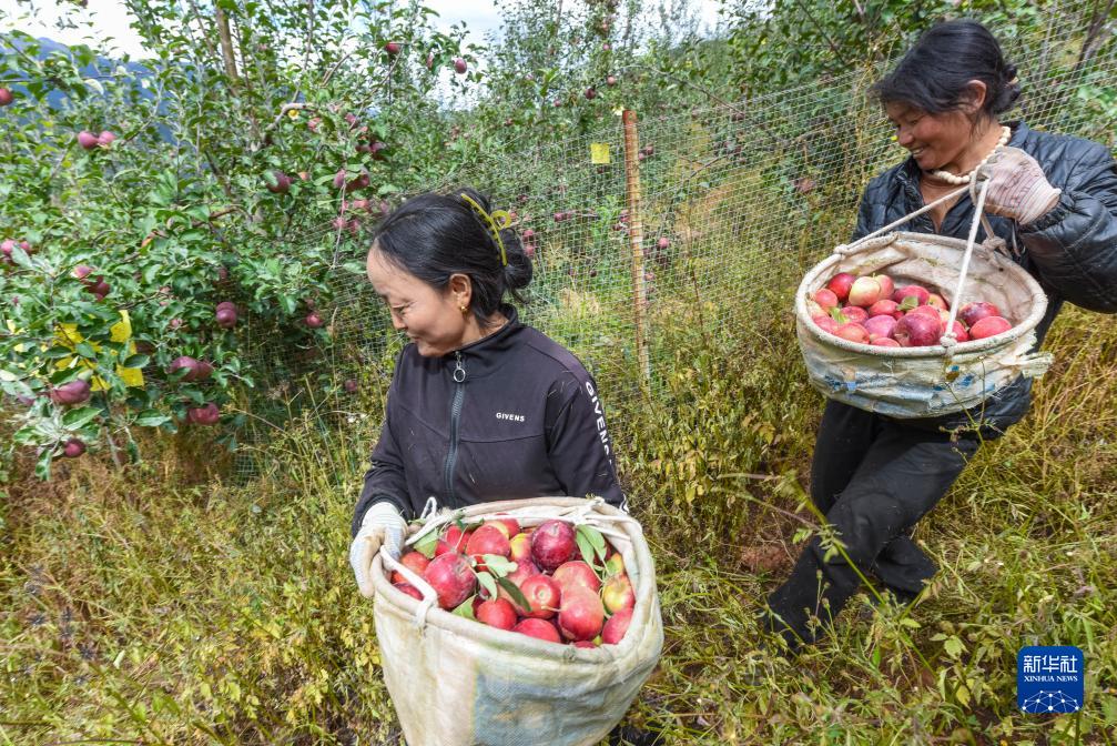 10月13日,在鄉(xiāng)城縣“蘋果+藏豬”種養(yǎng)循環(huán)現(xiàn)代農(nóng)業(yè)園區(qū)內(nèi)的有機(jī)蘋果種植示范基地,當(dāng)?shù)夭刈迦罕姴烧O果。新華社記者 黃曉勇 攝