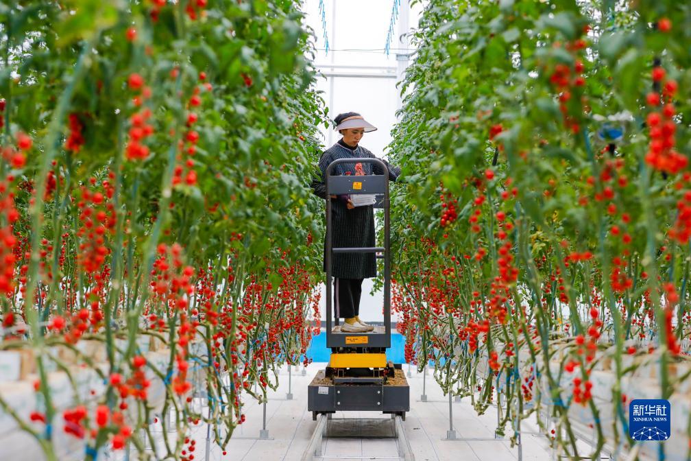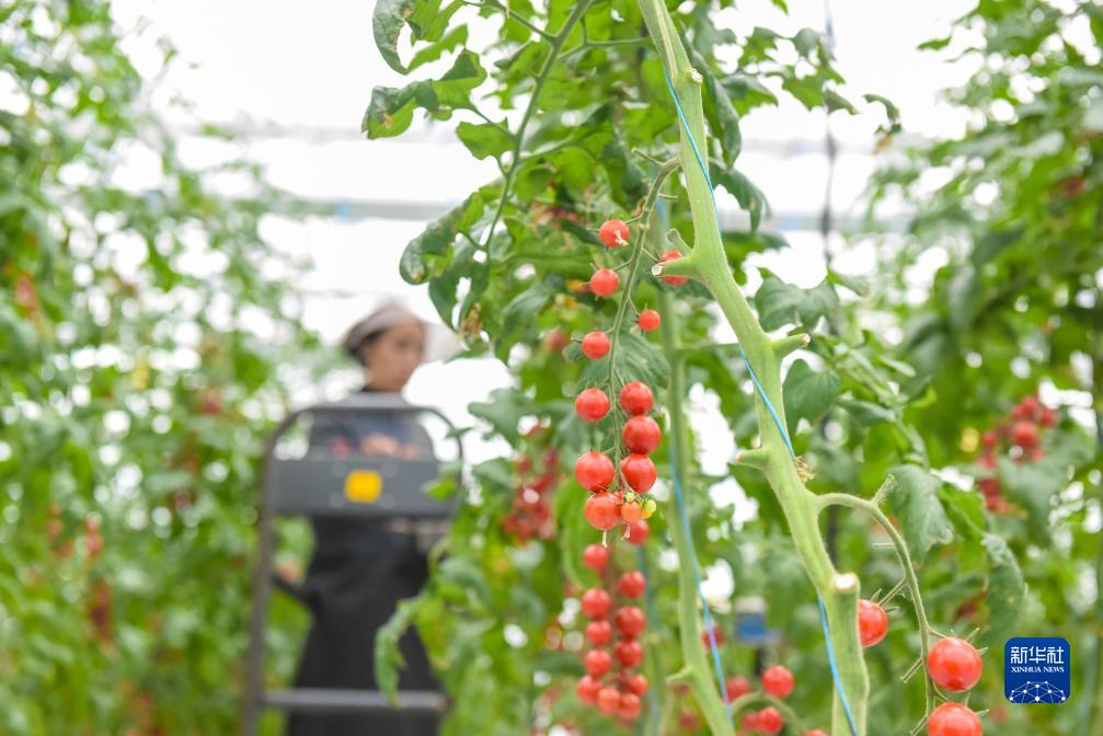10月13日,在理塘縣瑪吉阿米花園農(nóng)莊的智慧農(nóng)業(yè)無土栽培館,當(dāng)?shù)夭刈迦罕姴烧t色小番茄。新華社記者 黃曉勇 攝