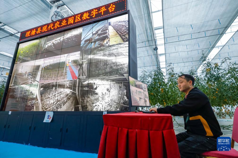 10月13日,理塘縣瑪吉阿米花園農(nóng)莊負(fù)責(zé)人丁義通過理塘縣現(xiàn)代農(nóng)業(yè)園區(qū)數(shù)字平臺查看農(nóng)莊不同區(qū)域的運轉(zhuǎn)情況。新華社記者 沈伯韓 攝
