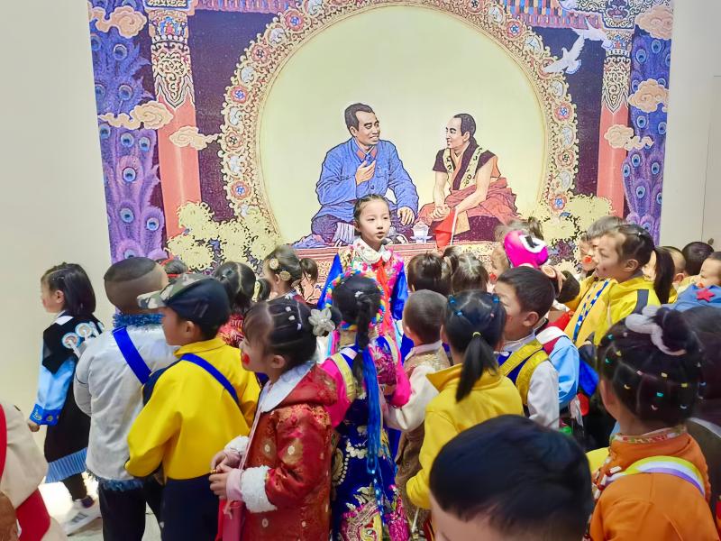 展館內(nèi),“格?;ㄐ⌒≈v解員”進(jìn)行著生動(dòng)地講解,通過一件件文物、一幅幅圖片、一個(gè)個(gè)互動(dòng)景觀訴說雪域高原上的紅色歷史,引導(dǎo)小朋友們體悟那段不平凡的崢嶸歲月,在行走的課堂里收獲知識(shí)和成長。