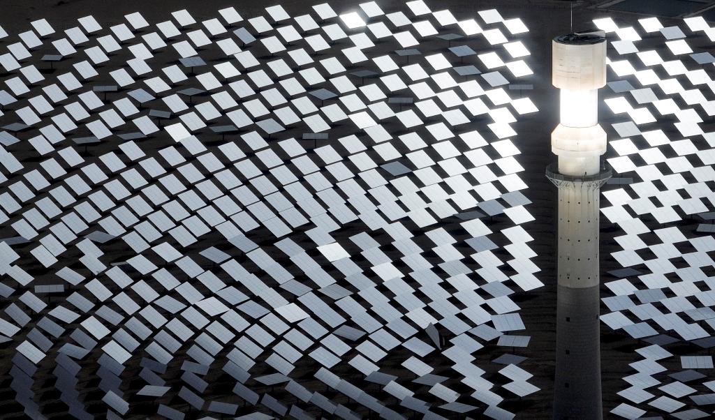 蔚藍(lán)色的光伏板在陽光照射下熠熠生輝,光能便轉(zhuǎn)化成源源不斷的電能;風(fēng)力發(fā)電機的葉片迎風(fēng)飛轉(zhuǎn),風(fēng)被“捕捉”進(jìn)一條條輸電線;百米高的吸熱塔和“鏡子海洋”組成熔鹽塔式光熱電站,科技感與綠色減碳有機結(jié)合……