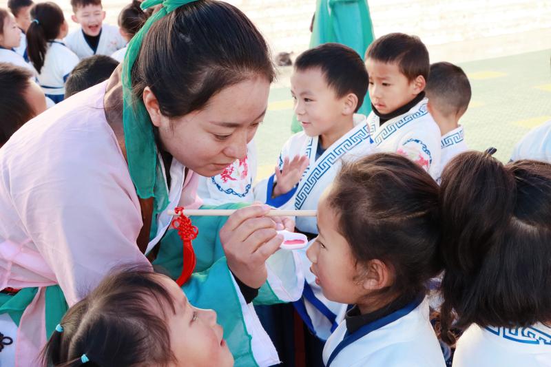 孩子們身著漢服,在老師的引導(dǎo)下有條不紊地完成過啟智門、正衣冠、朱砂開智、誦讀《三字經(jīng)》、擊鼓明志等儀式,充分感受博大精深的中國傳統(tǒng)文化,激發(fā)了學(xué)習(xí)進(jìn)取的動力。圖為老師為學(xué)生點(diǎn)朱砂,勉勵孩子們勤學(xué)習(xí)、懂禮儀,做一個道德高尚的人。