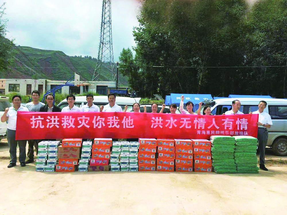 2022年,樂(lè)都區(qū)中壩藏族鄉(xiāng)發(fā)生洪災(zāi),黃得梅帶頭捐款,放映隊(duì)16名放映員買了一車方便面、牛奶、礦泉水和掛面送到了中壩。雖然洪水把很多路段都沖斷了,但是隊(duì)員們硬是用架子車把設(shè)備拉了上去,把溫暖和光影送給了受災(zāi)群眾。