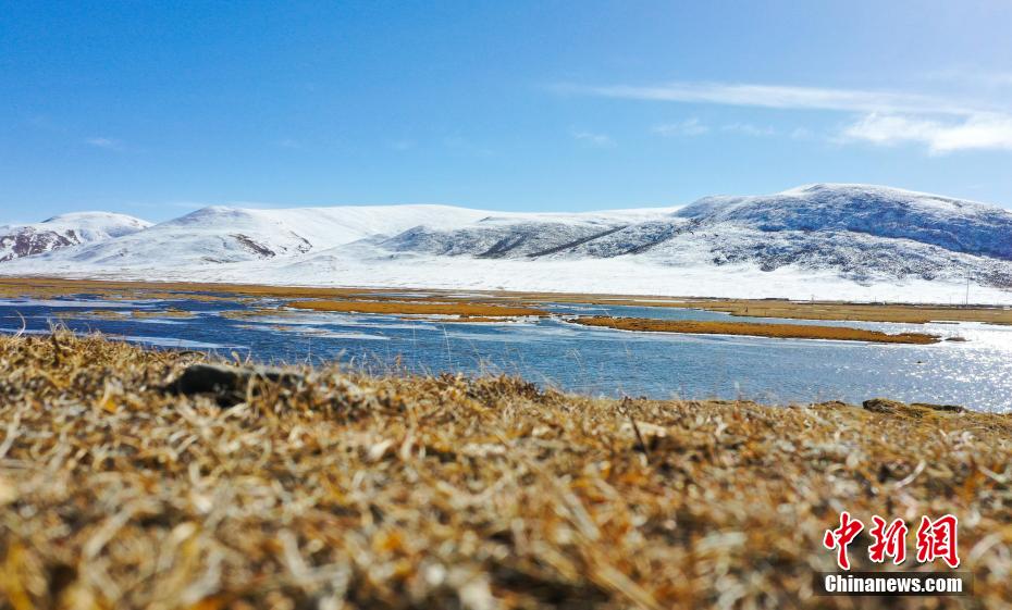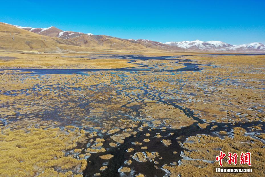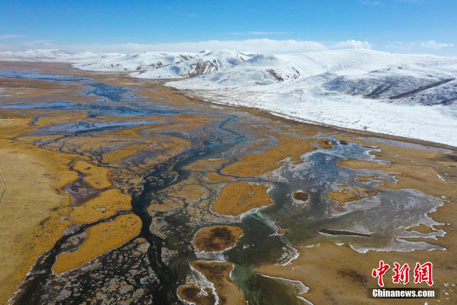 11月15日,航拍青海玉樹(shù)隆寶灘國(guó)際重要濕地冬日旖旎景色。降雪過(guò)后,位于青海省玉樹(shù)藏族自治州玉樹(shù)市境內(nèi)的隆寶灘國(guó)際重要濕地連綿的山巒被白雪覆蓋,與金色的草地和蜿蜒的河流交相輝映,景色旖旎。