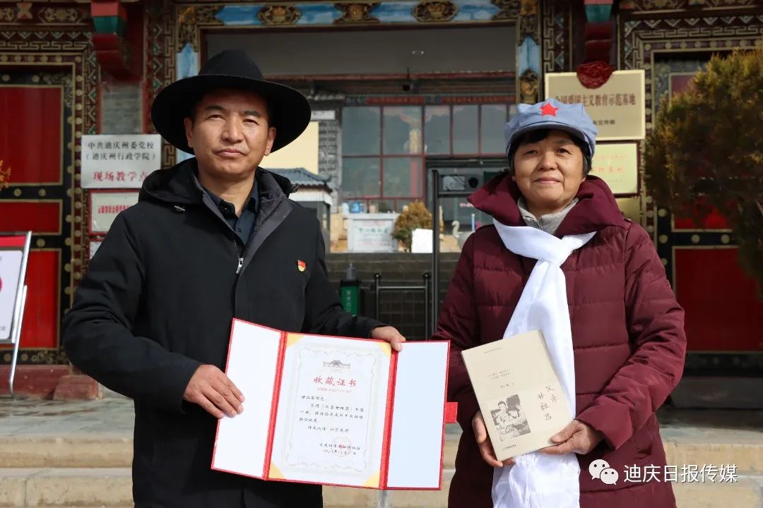 迪慶紅軍長征博物館館長潘高原代表博物館接收了這些珍貴的革命資料、實物,向他們授予了榮譽證書并在博物館前合影留念。
