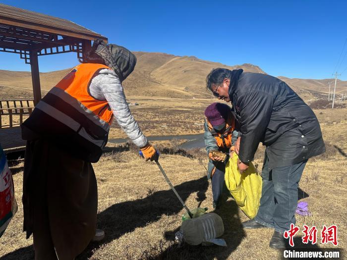 圖為斗格加(右一)和管護員們正在撿拾垃圾。劉洋 攝
