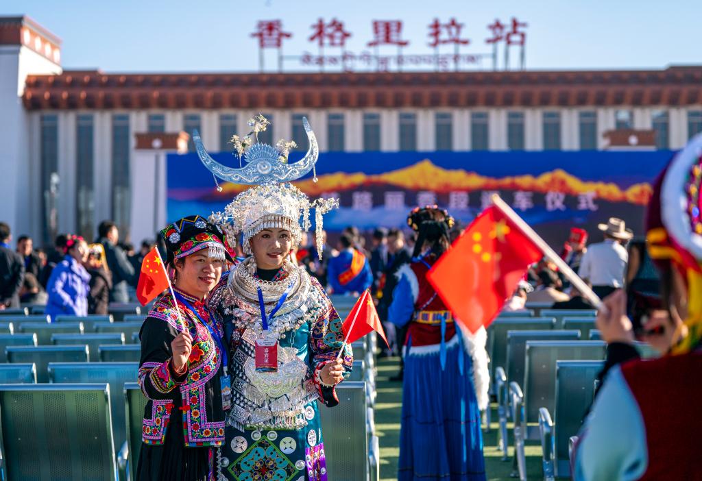 11月26日,參加麗香鐵路開(kāi)通儀式的少數(shù)民族代表在開(kāi)通儀式上拍照留念。新華社記者 陳欣波 攝