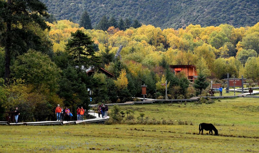 游人在云南迪慶州普達措景區(qū)里游覽。新華社記者 藺以光 攝