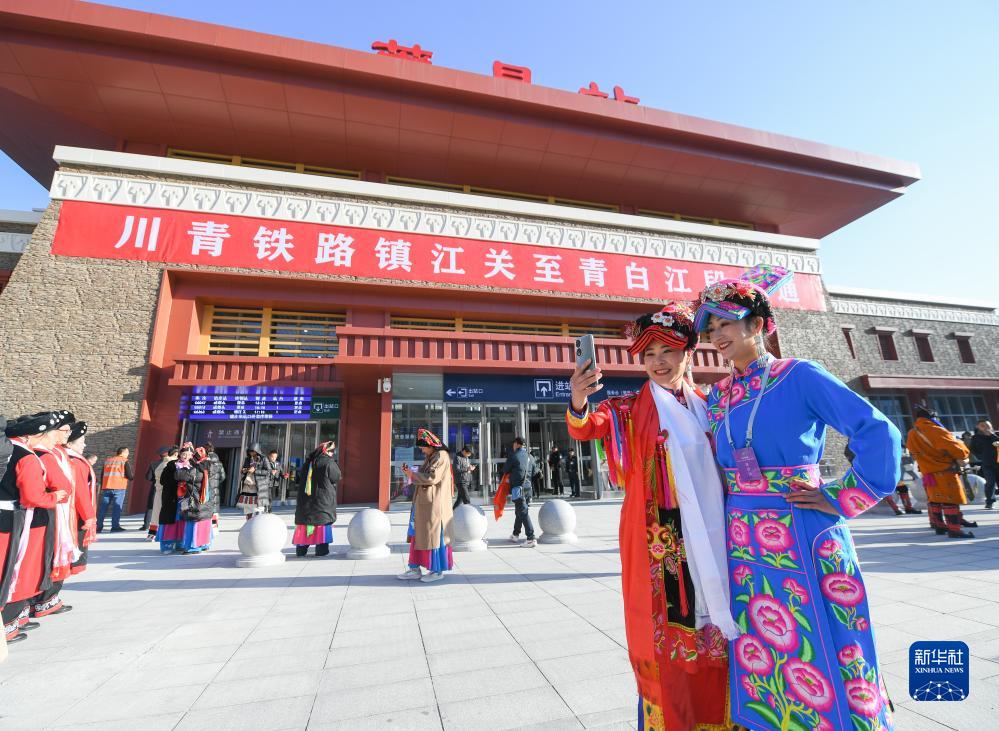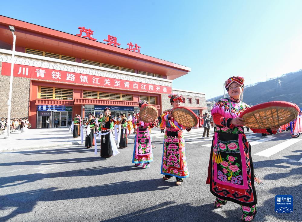 11月28日,在川青鐵路茂縣站,當?shù)馗髯迦罕娫谡厩皬V場慶祝鐵路開通運營。新華社記者 王曦 攝