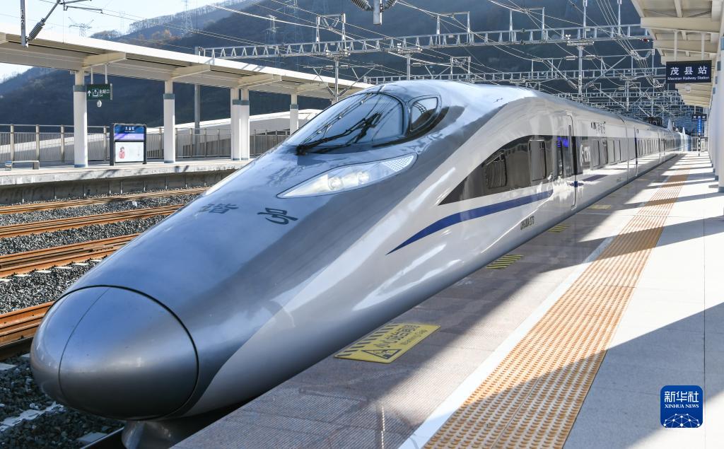 11月28日,C6008次首發(fā)列車駛入川青鐵路茂縣站。新華社記者 王曦 攝