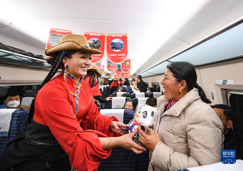 11月28日,在C6008次首發(fā)列車上,來自阿壩州民族歌舞團的演員給乘客贈送紀念品。新華社記者 王曦 攝