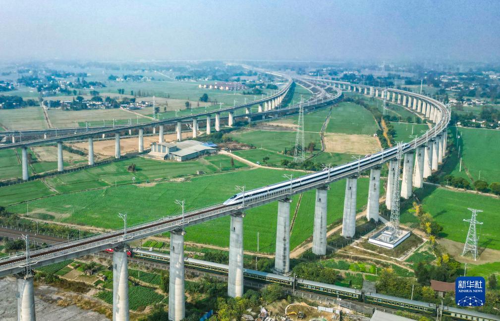 11月28日,在成都市青白江區(qū)境內拍攝的行駛在川青鐵路上的列車(上)和行駛在西成高鐵線上的列車(下)(無人機照片)。新華社記者 王曦 攝