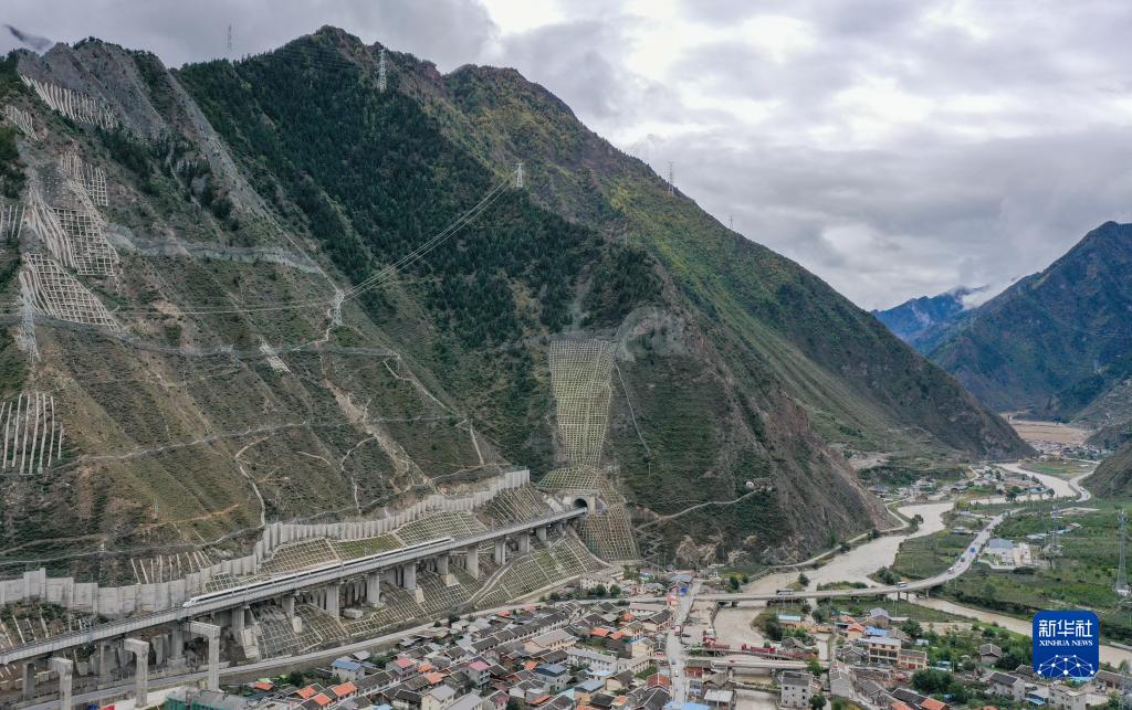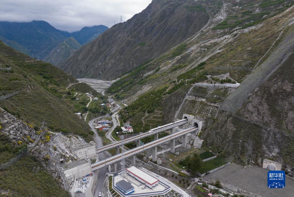 調試列車駛出川青鐵路榴桐寨隧道(11月13日攝,無人機照片)。新華社記者 江宏景 攝