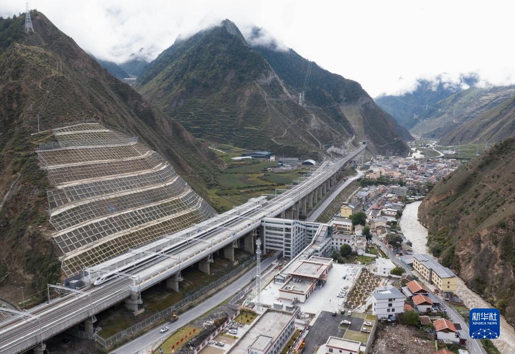 調試列車駛入川青鐵路茂縣站(10月13日攝,無人機照片)。新華社記者 王曦 攝