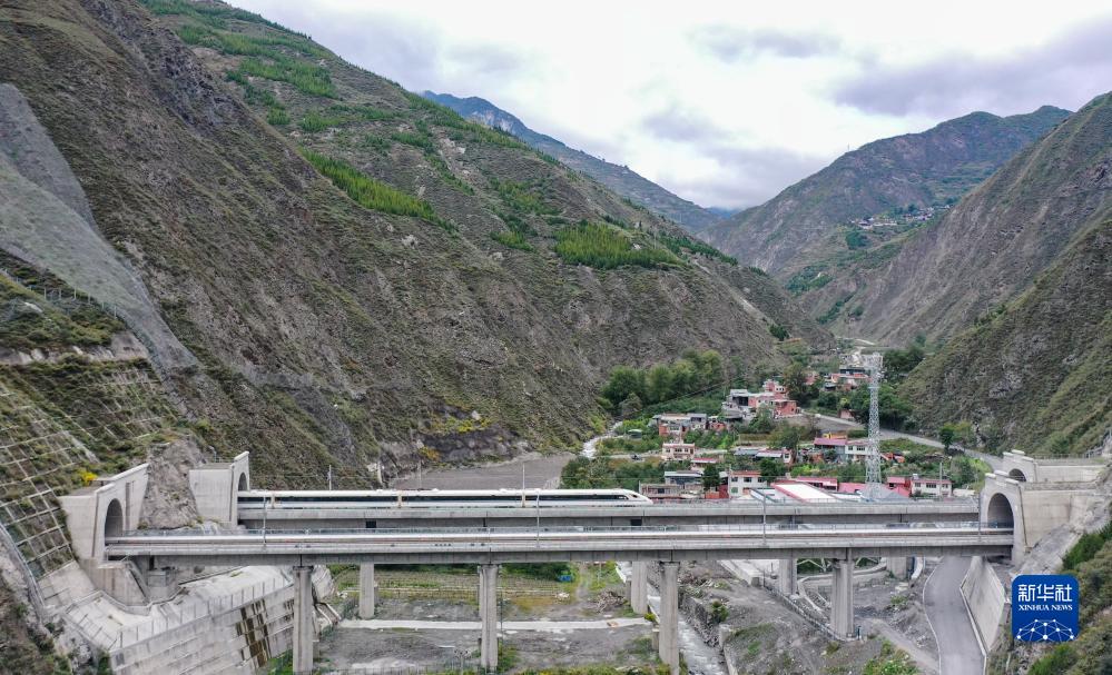 調試列車駛過川青鐵路榴桐寨隧道(10月12日攝,無人機照片)。新華社記者 王曦 攝