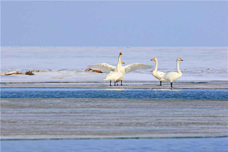 天鵝在結(jié)冰的湖面舒展雙翅。 郭輝忠 攝