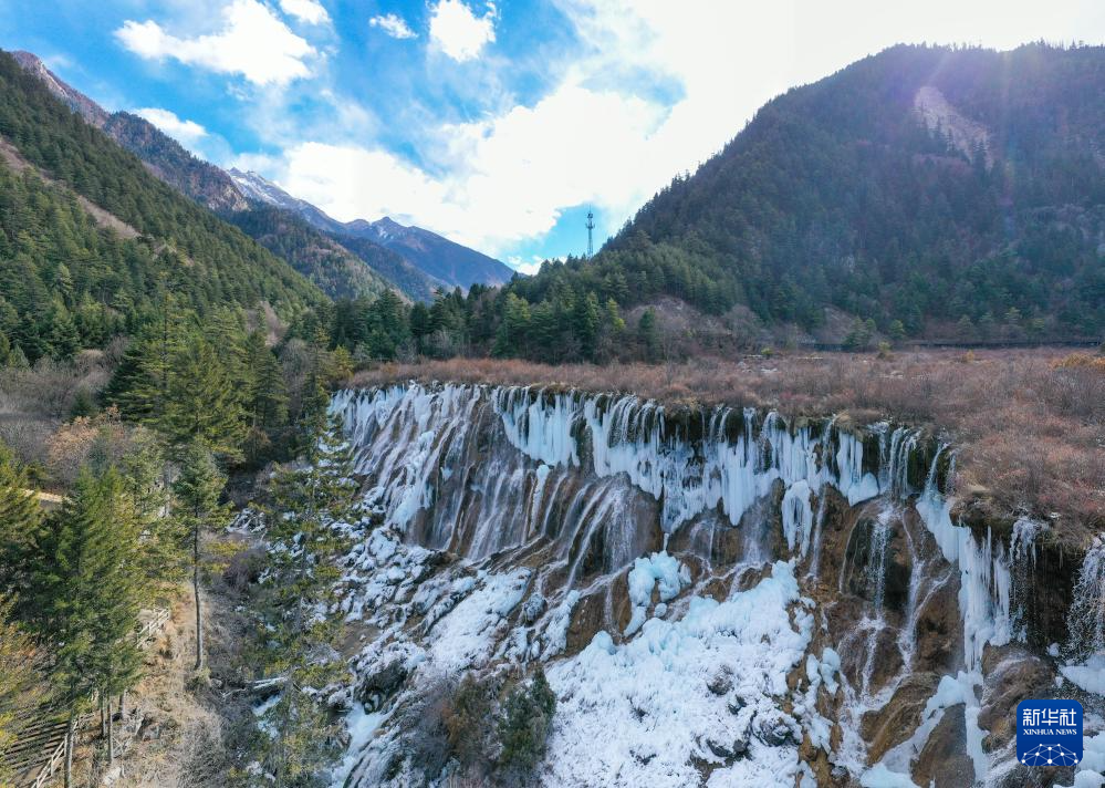 這是1月4日在四川省九寨溝風(fēng)景名勝區(qū)拍攝的諾日朗瀑布形成的冰瀑景觀(無人機(jī)照片)。新華社記者 王曦 攝