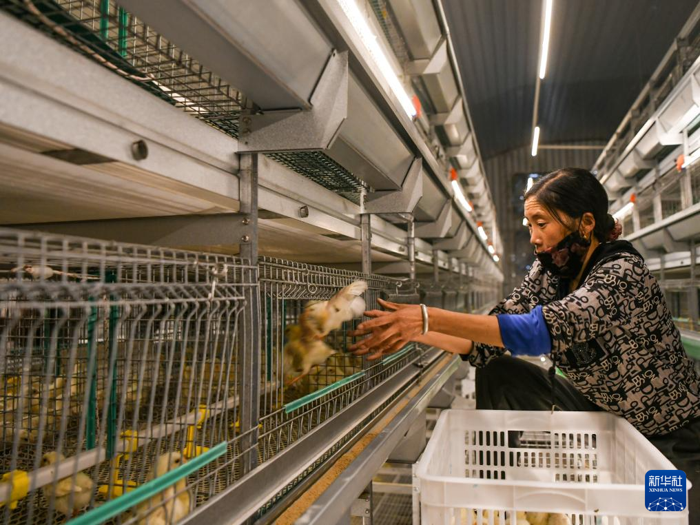 1月12日,在松潘縣鎮(zhèn)坪鄉(xiāng)新民蛋雞養(yǎng)殖生產(chǎn)基地,工人將雞苗投放到雞舍中。新華社記者 王曦 攝