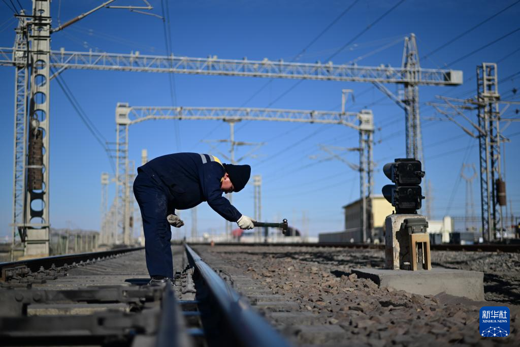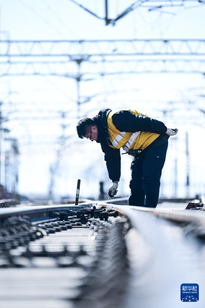 1月29日,格爾木電務(wù)段格爾木東信號車間察爾汗信號工區(qū)職工楊正宏在對察爾汗站道岔進(jìn)行檢修作業(yè)。新華社記者 張龍 攝