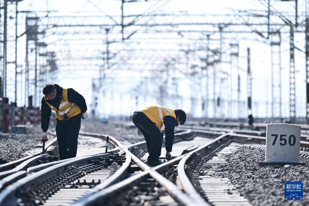 1月29日,格爾木電務(wù)段格爾木東信號車間察爾汗信號工區(qū)職工楊正宏(左)和胡進(jìn)海在對察爾汗站道岔進(jìn)行檢修作業(yè)。新華社記者 張龍 攝