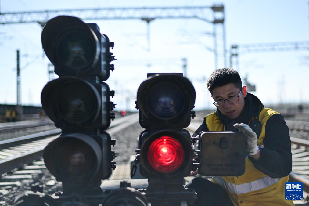 1月29日,格爾木電務(wù)段格爾木東信號車間察爾汗信號工區(qū)副工長張世鐸在檢修信號機(jī)。新華社記者 張龍 攝