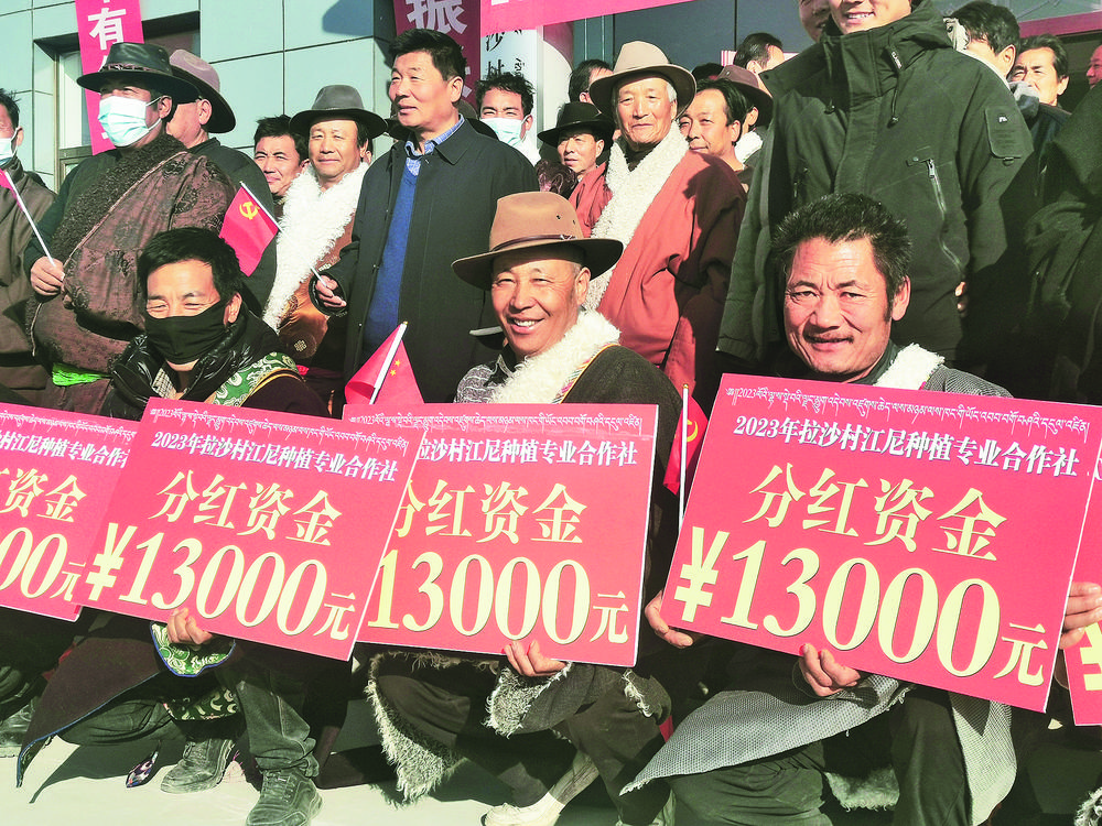 這是拉沙村江尼種植專業(yè)合作社的第三次分紅,也是分紅金額最大的一次。與村民一起將煙花爆竹放置在院落四周,村黨支部書記旦增尖措臉上寫滿了喜悅:“今天我們村又迎來了集體產(chǎn)業(yè)分紅,這次分紅84.5萬元,社員平均1.3萬元,大家切切實(shí)實(shí)享受了好政策帶來的紅利?!?/p>