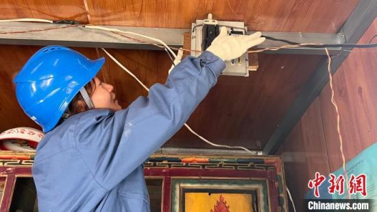 圖為扎西拉毛在結(jié)拉村義務(wù)檢查線路和更換開關(guān)。普布永措 攝