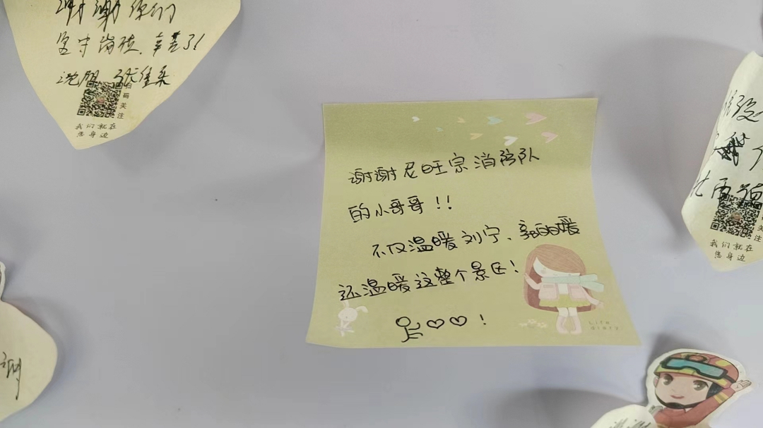 隊員們細(xì)致暖心的幫助與關(guān)懷,讓兩位遠(yuǎn)方的朋友萬分感激,并主動在“藍(lán)焰貼心服務(wù)留言墻”留下了他們最簡單最純真最溫暖的話語:“謝謝尼旺宗消防隊的小哥哥,不僅溫暖劉寧、郭麗媛,還溫暖這整個景區(qū)!”