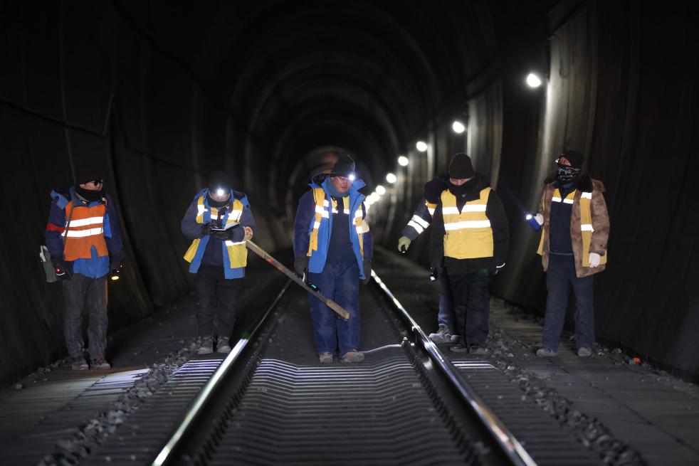 張福強(qiáng)(中)和工友們?cè)陲L(fēng)火山隧道內(nèi)檢修。(中國鐵路青藏集團(tuán)有限公司格爾木工務(wù)段提供)