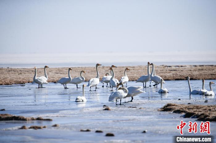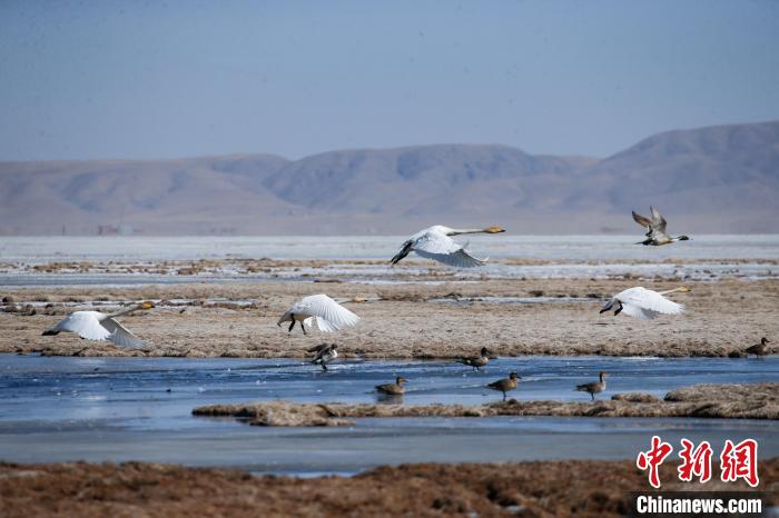 3月13日,青海省海南藏族自治州共和縣境內(nèi)的青海湖泉灣濕地,大天鵝沐浴春日暖陽。隨著天氣轉(zhuǎn)暖,大天鵝、斑頭雁、赤麻鴨等水鳥聚集在青海湖泉灣濕地,時而振翅飛翔、時而戲水覓食,鳴叫聲不絕,為仍處于冰封的青海湖增添生機(jī)和活力。
