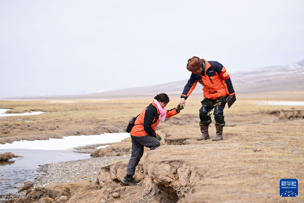 3月21日,葉金俄日(左)與東木措在青海省海北藏族自治州祁連縣的黑河流域巡護。新華社記者 張龍 攝