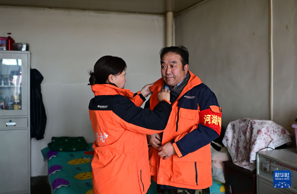 3月21日,葉金俄日(右)與妻子?xùn)|木措在巡護前整理衣服。新華社記者 耿輝凰 攝