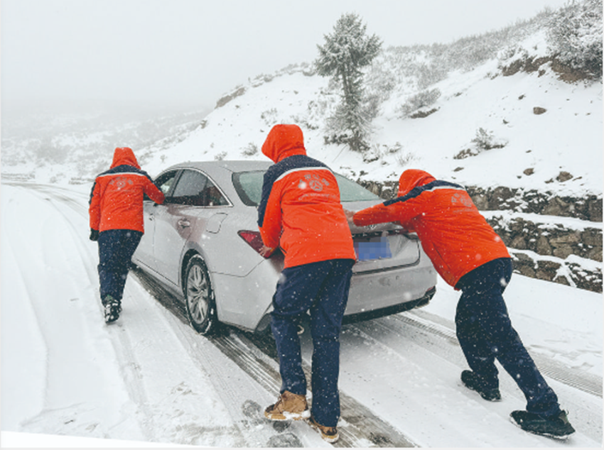理塘公路分局組織沿線各站點派遣除雪保通隊伍,采用科學合理的方式配置機械設備,全身心地投入到除雪保通的艱巨任務之中。各個作業(yè)點運用高效的作業(yè)方式,以機械化作業(yè)為主導,人工輔助為支撐鋪撒防滑沙,竭力保障道路通行的安全。作業(yè)人員全力以赴、分秒必爭地清除道路積雪,奮力守護公路的安全與暢通無阻。在巡查過程中,工作人員幫助被困車輛從積雪中解救出來,確保道路暢通。