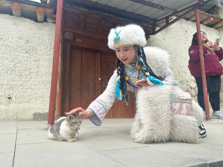 在景區(qū)內(nèi),隨處可見身穿藏族服飾、化上高原紅曬傷妝的游客們變身“扎西和卓瑪”,攝影師圍著她們忙前忙后,快門聲此起彼伏?!班牛谩薄熬褪沁@樣,保持笑容”“下巴揚(yáng)起來”……在攝影師的引導(dǎo)下,““扎西和卓瑪””變換著姿勢,拍下一張張景區(qū)打卡照。