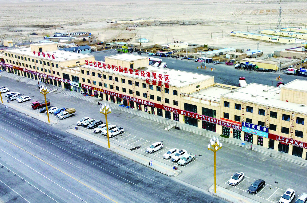 從都蘭縣城出發(fā),沿著109國道向西行駛100多公里,到達巴隆鄉(xiāng)109國道物流經濟服務區(qū)。整個服務區(qū)干凈整潔,道路一側是一排黃色三層小樓,各類商鋪云集,樓前的空地上停放著不少車輛。