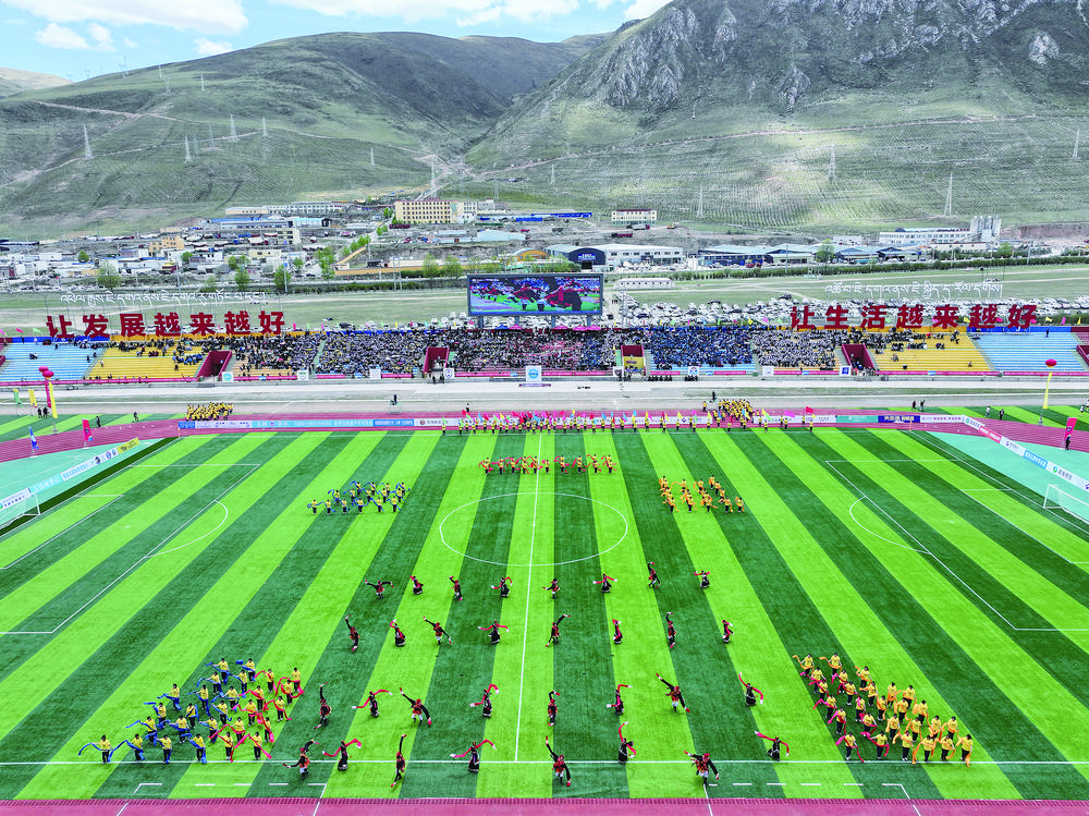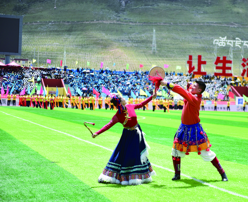 13時30分,一曲精彩的《熱巴舞》拉開開幕式序幕,現(xiàn)場觀眾熱情似火,掌聲不斷。“飛躍的玉樹足球,有我揮灑的青春……”隨著本土歌手嘎瑪西周創(chuàng)作的歌曲《點燃夢想》唱響,玉樹牦牛隊主場氛圍“拉滿”。
