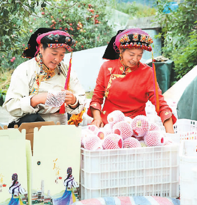 四川省甘孜藏族自治州丹巴縣的村民正在包裝“美人脆”蘋(píng)果。降初澤郎 攝