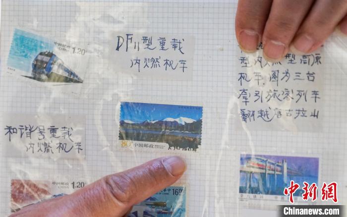 圖為徐超展示其收藏的中國(guó)郵政為紀(jì)念青藏鐵路全線建成通車,于2006年7月1日發(fā)行的一套紀(jì)念郵票中的其中一枚名為《列車駛過(guò)唐古拉山》的郵票。 馬銘言 攝