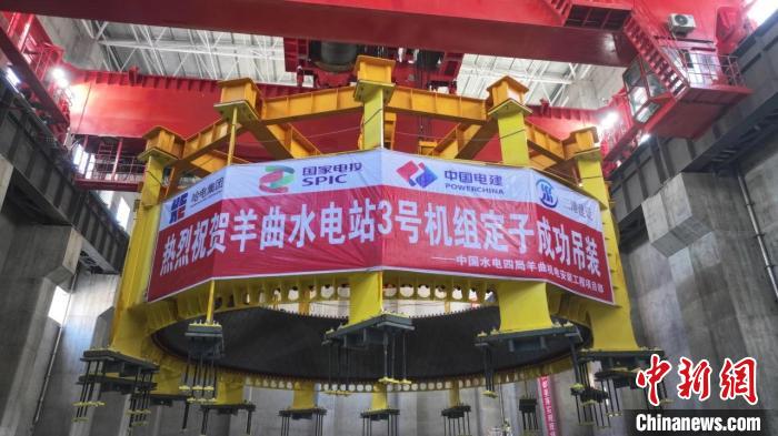 圖為黃河羊曲水電站3號機組定子完成吊裝。國家電投黃河水電公司供圖