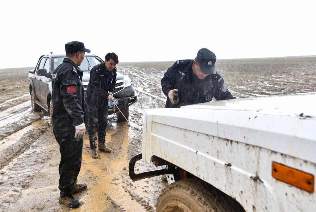 2020年7月6日,卓乃湖保護(hù)站站長(zhǎng)秋培扎西(右)和巡山隊(duì)員更松多杰(左)、白瑪東周在可可西里地區(qū)冒雨拉車。新華社 張龍 攝